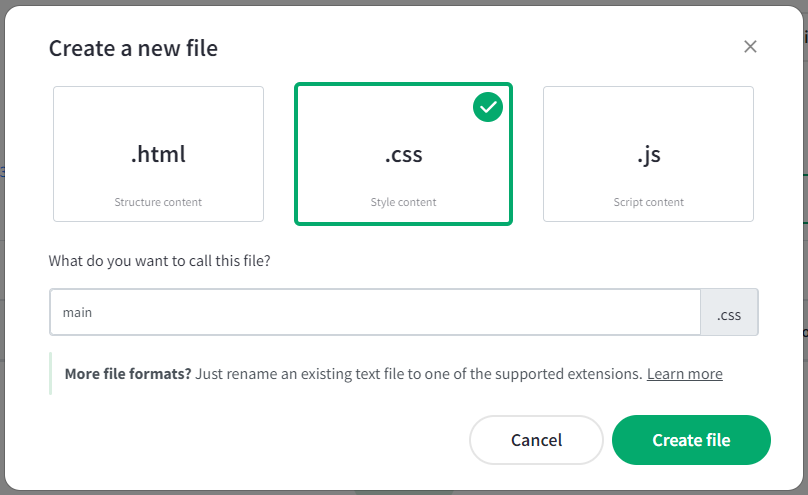 Select the .css Style content option, name the file main all lowercase, then click the "Create file" button.